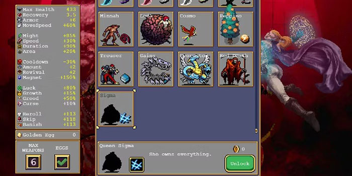 Nếu đã bắt đầu với Collection đầy đủ, người chơi có thể cần phải chơi trước và sau đó thoát khỏi màn chơi để Queen Sigma xuất hiện trong quá trình chọn nhân vật. Người chơi không cần tốn vàng để mở khóa Sigma trong màn hình chọn nhân vật.