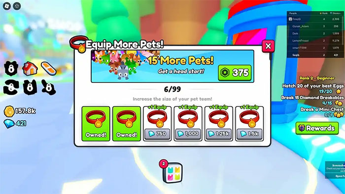Nhà cung cấp Equip More Pet nằm ở khu vực có thể mở khóa thứ ba trong Pet Simulator 99. Khi mở khóa khu vực này, hãy đi về phía bên trái và mọi người sẽ dễ dàng tìm thấy nơi để mua thêm vòng cổ cho thú cưng của mình. Tương tác với cửa hàng để thấy menu mua vòng cổ để sử dụng nhiều vật nuôi hơn cùng một lúc.