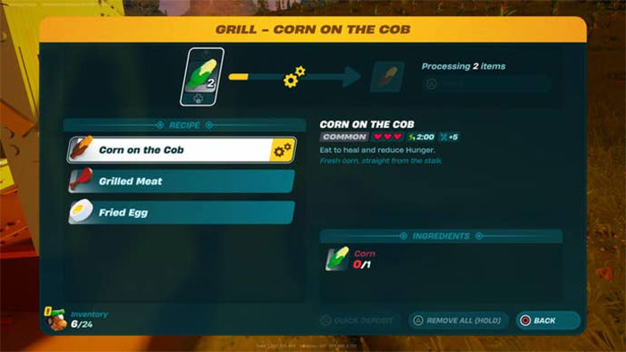 | Corn on the Cob | 1 Corn | +3 Heart, 2:00 Stamina, +5 Hunger |