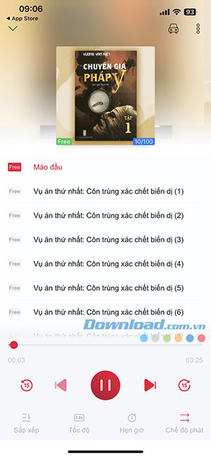 Bước 4: Giao diện nghe audiobook trên MyDio như hình dưới đây. Mọi người có thể thực hiện một số thao tác như Sắp xếp thứ tự chương, chỉnh Tốc độ nhanh chậm, Hẹn giờ tắt nghe truyện và Chế độ phát lặp lại.