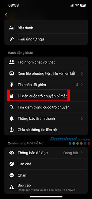 Bước 3: Điều hướng tới danh mục Hành động khác và chọn Đi đến cuộc trò chuyện bí mật.