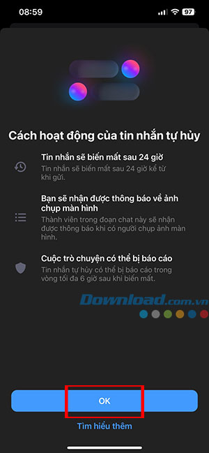 Điều này sẽ quyết định tin nhắn chỉ tồn tại trong 24 giờ sau khi người nhận đọc nó, đồng thời cho phép cả mọi người nhận thông báo về ảnh chụp màn hình.