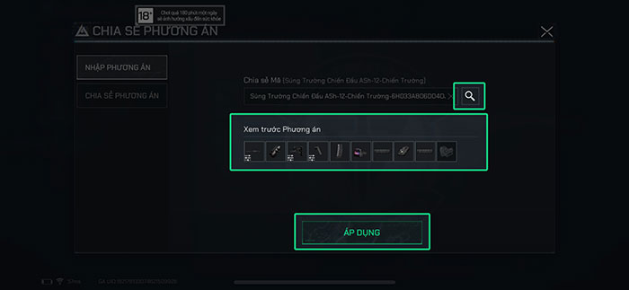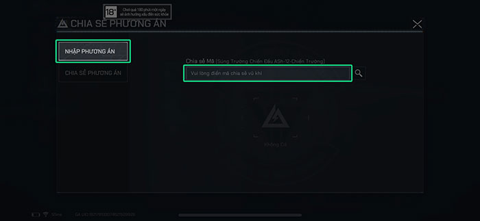 Bước 6: Tại đây, chọn Nhập phương án rồi dán mã thiết lập súng vào ô văn bản để nhập thiết lập từ người chơi khác.