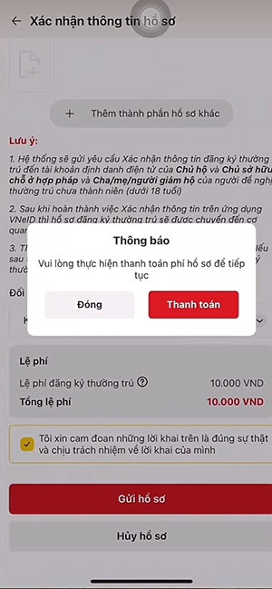 Bước 9: Thực hiện thanh toán lệ phí theo hướng dẫn để hoàn tất nộp hồ sơ nhập khẩu vợ về nhà chồng trên VNeID.