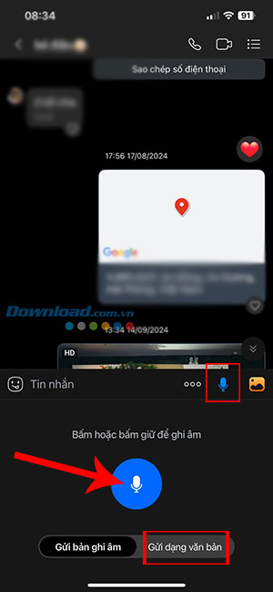 Bước 2: Tại giao diện trò chuyện, chạm vào biểu tượng micro ở cạnh hộp nhập tin nhắn văn bản. Sau đó, chọn Gửi bản ghi âm (nếu muốn gửi bản ghi tin nhắn thoại) hoặc Gửi dạng văn bản (nếu muốn gửi tin nhắn dạng văn bản).