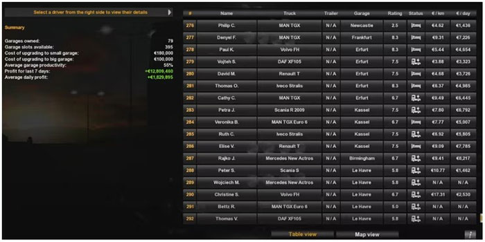 Người chơi có thể kiểm tra tài xế thông qua người quản lý gara, hiển thị toàn bộ hoạt động của nhà để xe, bao gồm cả các tài xế làm tại đó. Cách thứ hai là mở Driver Manager và chọn danh sách lái xe. Điều này cung cấp danh sách đầy đủ các tài xế dưới sự kiểm soát của người chơi, bao gồm trạng thái vị trí của họ, tổng thu nhập, xe tải được chỉ định và trạng thái hiện tại.