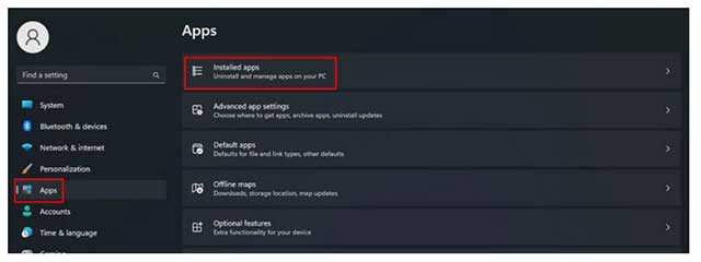 Trong Cài đặt, hãy nhấp vào Apps (Ứng dụng), tiếp theo là Installed apps (Ứng dụng đã cài đặt).