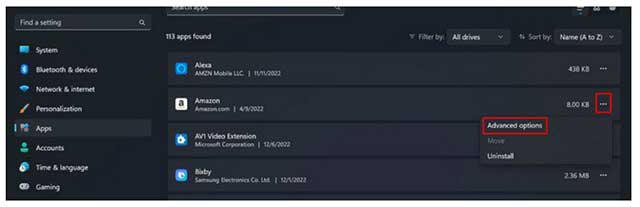 Bạn sẽ thấy một danh sách các ứng dụng bạn đã cài đặt. Xem qua danh sách và khi bạn tìm thấy Ứng dụng bạn muốn đặt lại, hãy nhấp vào dấu chấm ở bên phải và chọn Advanced options (Tùy chọn nâng cao).