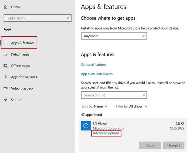 Nếu có nhiều ứng dụng, hãy nhớ rằng bạn cần chuyển đến tùy chọn ứng dụng đã cài đặt. Ở đó bạn sẽ thấy các ứng dụng đã cài đặt. Nhấp vào dấu chấm > Advanced option(Tùy chọn nâng cao). Bạn có thể làm điều này với bao nhiêu ứng dụng tùy thích.