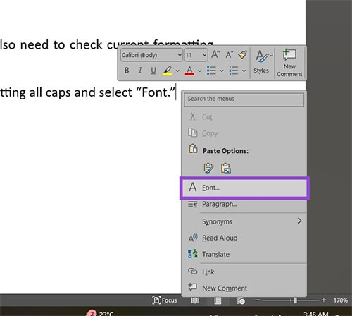 Bước 1: Trong Word, nhấp chuột phải vào đoạn văn bản đang bị in hoa rồi chọn Font.