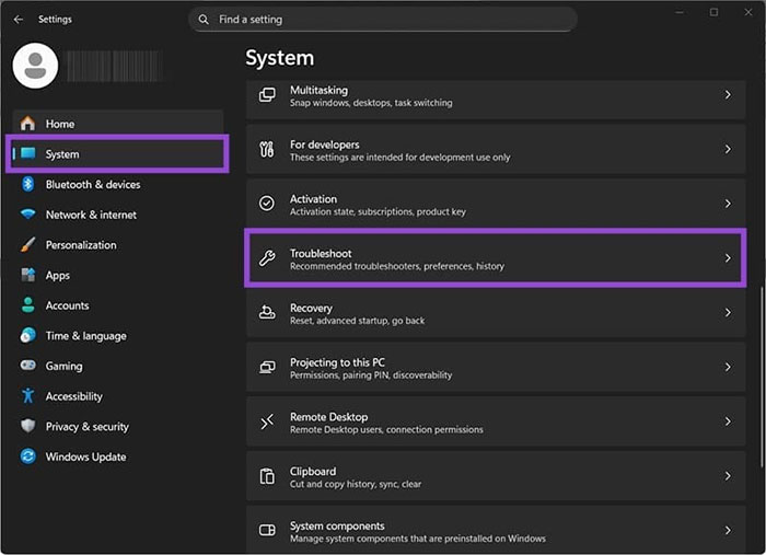 Bước 2: Vào tab System và chọn Troubleshoot.