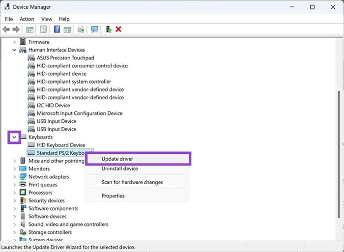 Ngoài ra, người dùng cũng có thể cập nhật driver bàn phím thủ công bằng Device Manager: