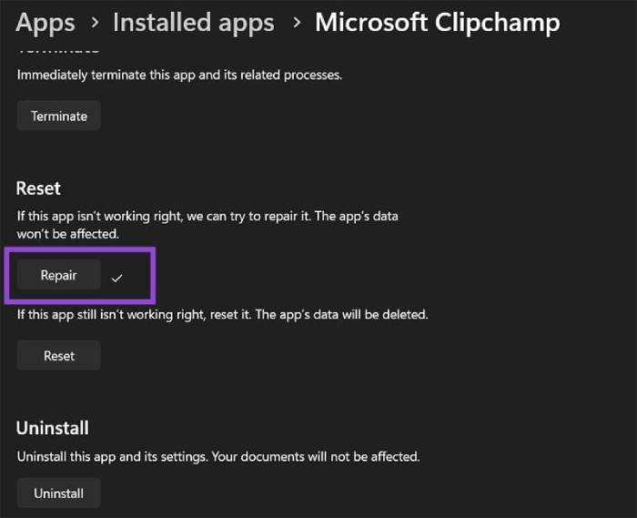 Nếu ClipChamp vẫn không hoạt động, người dùng có thể đặt lại ứng dụng, thao tác này sẽ xóa toàn bộ dữ liệu và đưa ứng dụng về trạng thái mặc định ban đầu.