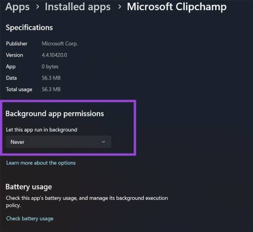 Ngoài ra, mọi người cũng có thể thay đổi cài đặt chạy nền của ứng dụng để ngăn ClipChamp hoạt động ở chế độ nền, tránh việc tích tụ dữ liệu.