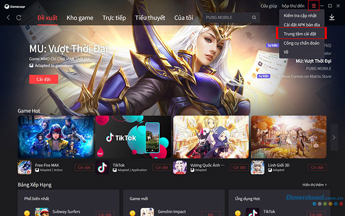 Đầu tiên, nhấn vào biểu tượng ba gạch ngang ở góc trên bên trái và chọn Trung tâm cài đặt để mở cài đặt GameLoop.