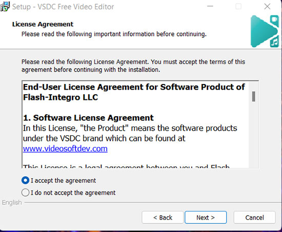 Bước 4: Chấp nhận điều khoản của VSDC Free Video Editor bằng cách chọn I accept the agreement và nhấn Next.