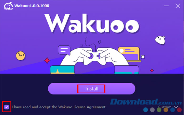 Bước 4: Tích vào ô I have read and accept the Wakuoo License Agreement và chọn Install.