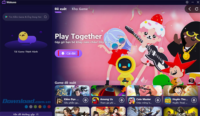 Bước 6: Giao diện chính của Wakuoo sẽ xuất hiện với vô số trò chơi. Mọi người có thể nhấn vào tab Kho game để xem các danh mục như Game Hot, Game Mới, Ứng dụng Hot. Nhấn vào Cài đặt để tải về bất kỳ ứng dụng nào.