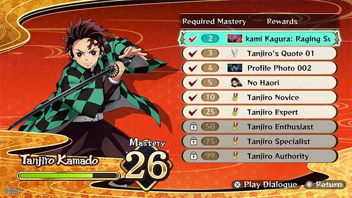 Mỗi khi chơi một nhân vật trong Demon Slayer: The Hinokami Chronicles 2, mọi người sẽ tích lũy điểm Character Mastery, với cấp độ tối đa là Level 99. Game thủ chỉ cần tiếp tục sử dụng nhân vật đó trong Story Mode, Training Paths, Versus Mode hoặc Online.