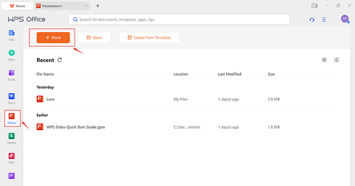 Bước 2: Trên màn hình chính, chọn Slides > Blank.