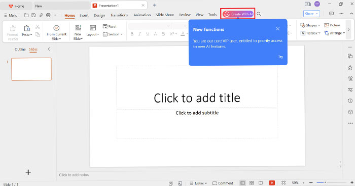 Bước 3: Nhấn Create with AI để truy cập tính năng WPS AI Slides.