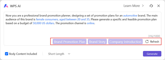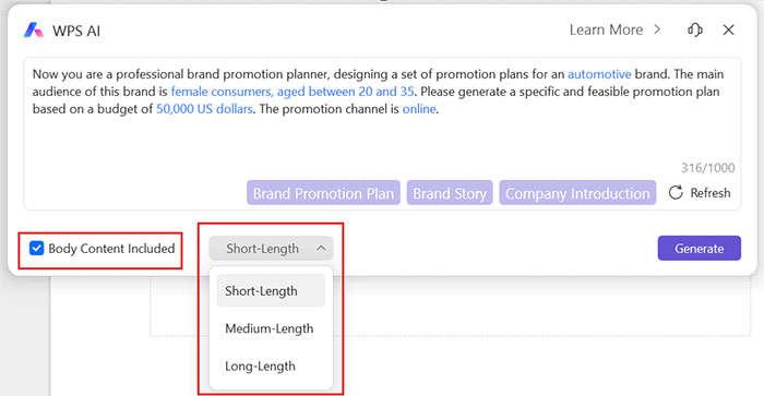 Bước 4: Trong cửa sổ WPS AI, mọi người có thể tùy chỉnh thiết lập như sau: