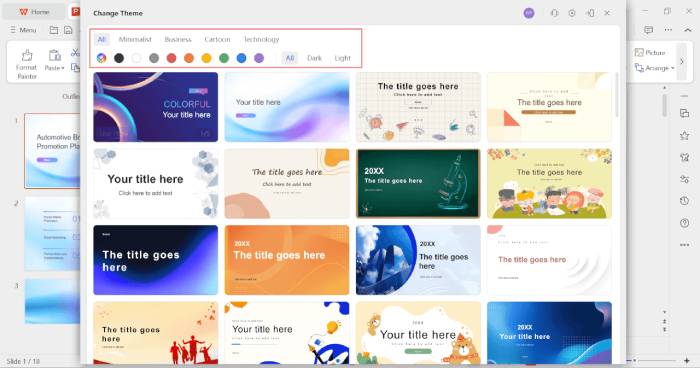 Bước 2: Tại đây, người dùng có nhiều tùy chọn, có thể lọc theo các chủ đề như Minimalist, Business, Cartoon, Technology hoặc lọc theo màu sắc. Chỉ cần chọn mẫu mình muốn, theme sẽ được đổi ngay lập tức.
