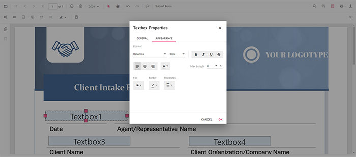 Bước 4 (tùy chọn): Nhấp đúp vào trường vừa chèn để tùy chỉnh thuộc tính: tên trường, giá trị mặc định, định dạng, xác thực,...