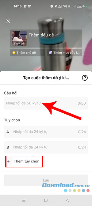 Mở TikTok > nhấn vào dấu cộng tạo mới > vuốt sang trái để mở LIVE > nhấn vào Bình chọn > nhập các thông tin trong cửa sổ Tạo cuộc thăm dò ý kiến > nhấn nút Lưu.