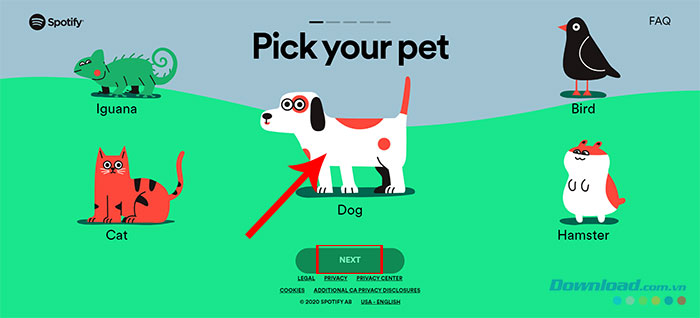 Sau đó, chọn thú cưng của mình (chó, mèo, chim, hamster và iguana) và nhấp vào Next.