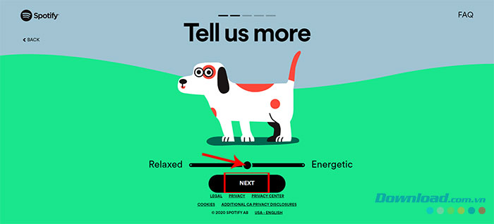 Bước 3: Tiến hành trả lời một số câu hỏi liên quan đến tính cách của thú cưng. Đầu tiên, sử dụng thanh trượt để hiển thị mức độ năng động (Energetic) hoặc thư giãn (Relaxed) của thú cưng. Sau đó, nhấp vào Next