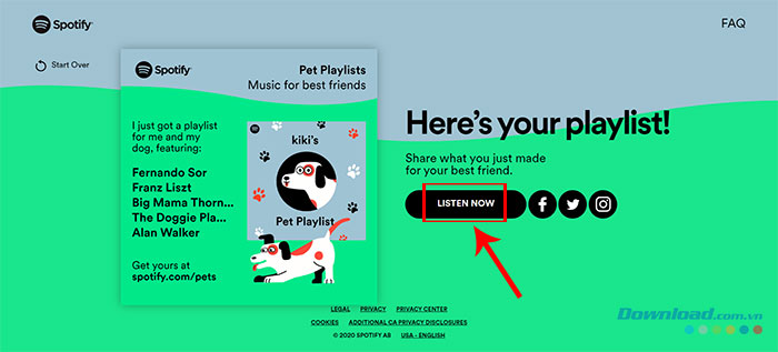 Bước 7: Đợi một lúc để Spotify sử dụng thông tin đầu vào của người dùng và biên soạn danh sách phát tương ứng cho thú cưng. Sau khi quá trình hoàn tất, bấm vào Listen Now.
