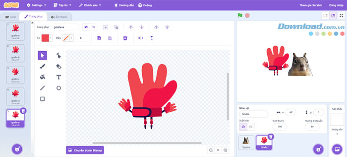 Để đơn giản, mọi người có thể chọn sprite Squirrel để đại diện cho chuột chũi và Goalie cho chiếc búa. Truy cập tab Costumes và chỉnh sửa Goalie để thêm hiệu ứng “đập” (có thể thay đổi tư thế tay).