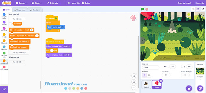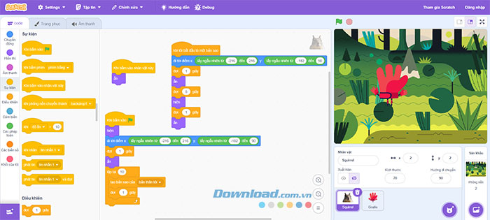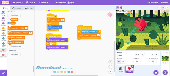 Mỗi khi người chơi nhấn chuột để “đập” Squirrel, giá trị của biến sẽ tăng lên 1. Vì đã có 10 bản sao được tạo, nên người chơi cần ít nhất 11 lần đập để chiến thắng. Giá trị ban đầu của biến sẽ được đặt là 0 bằng cách đặt khối lệnh này bên dưới sự kiện Khi bấm vào cờ xanh.