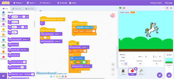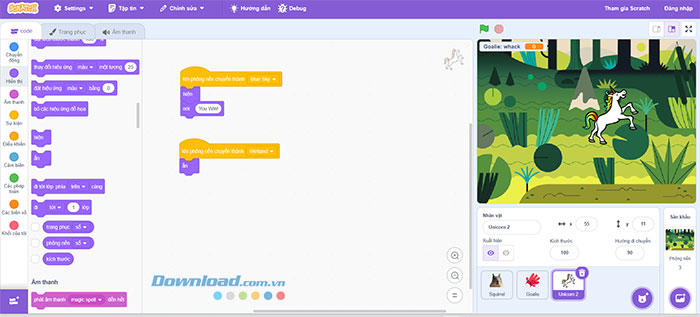 Khi điều kiện đúng, phông nền sẽ thay đổi. Và dựa vào phông nền mới, một sự kiện sẽ được kích hoạt để hiển thị sprite Unicorn với thông báo người chơi đã chiến thắng. Ngược lại, mỗi khi trò chơi bắt đầu lại, mọi người cần đổi phông nền trở về Wetland, đưa các sprite Squirrel và Goalie trở lại, đồng thời ẩn nhân vật Unicorn chiến thắng.