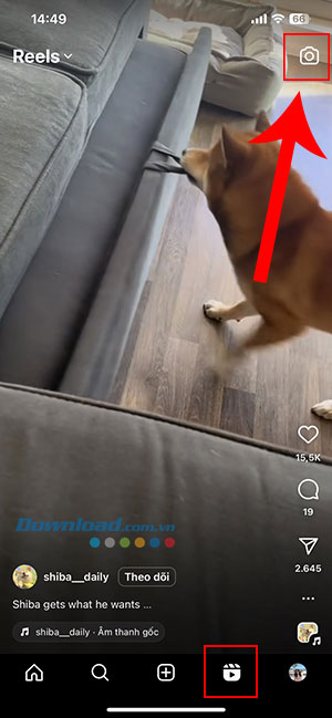 Bước 1: Mở Instagram trên điện thoại và nhấn vào biểu tượng Reels ở phía dưới. Sau đó chạm vào máy ảnh ở góc trên cùng bên phải.