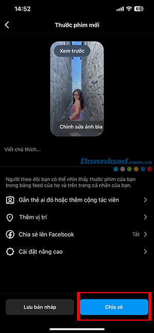 Bước 7: Thêm chú thích, gắn thẻ, vị trí,... và nhấn vào Chia sẻ để đăng đoạn video Instagram Reels đó lên trang cá nhân của mình.