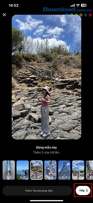 Bước 4: Nhấn vào Thêm file phương tiện. Chọn ảnh và video muốn đặt vào video theo yêu cầu số lượng của mẫu đó và nhấn vào Tiếp ở góc dưới bên phải.