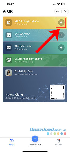 Bước 2: Tại giao diện chính của Ví QR, mọi người cần nhấn vào dấu cộng ở mục Mã QR chuyển khoản.