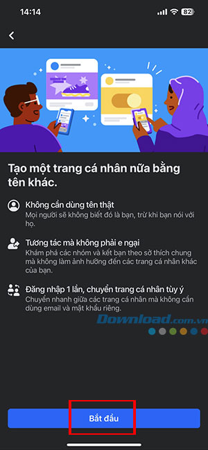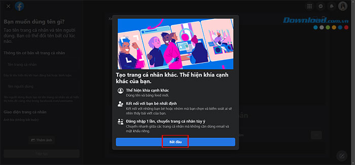 Bước 3: Ấn nút Bắt đầu để tiến hành tạo một trang cá nhân nữa bằng tên khác.