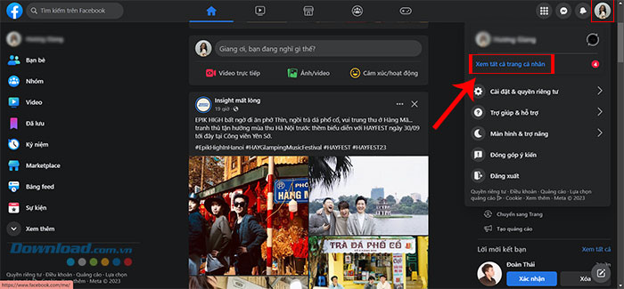 Bước 1: Truy cập và đăng nhập vào Facebook trên trình duyệt web. Sau đó, nhấn vào biểu tượng avatar ở góc trên cùng bên phải. Trong cửa sổ pop-up vừa mở, chọn Xem tất cả trang cá nhân.
