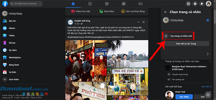 Bước 2: Nhấn vào Tạo trang cá nhân mới.