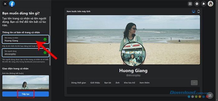 Bước 4: Nhập Tên trang cá nhân, Tên người dùng, thêm ảnh bìa và ảnh đại diện cho hồ sơ Facebook mới. Sau đó nhấn Tiếp tục.