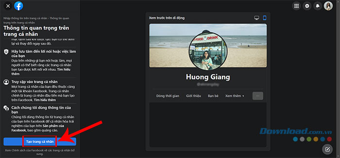 Bước 5: Click vào Tạo trang cá nhân để xác nhận và hoàn tất quá trình tạo trang cá nhân mới với một tài khoản Facebook chính.