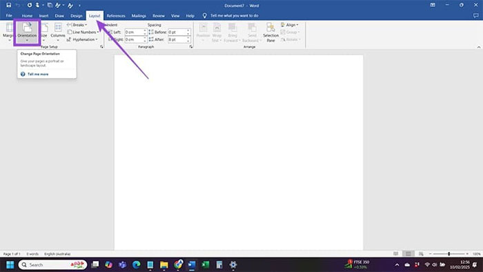 Bước 1: Nhấn vào tab Layout trên thanh công cụ và chọn biểu tượng Orientation.