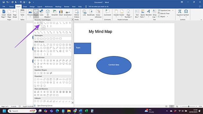 Bước 3: Dùng công cụ này để nối từ hình ý tưởng trung tâm đến hình chủ đề chính.