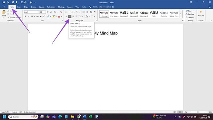 Khi tài liệu trống đã sẵn sàng, hãy nhập tiêu đề cho sơ đồ tư duy ở đầu trang. Để căn giữa tiêu đề, vào tab Home và nhấn nút Center Align.