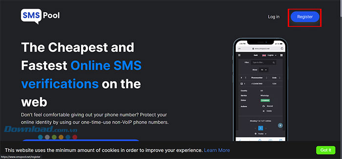 Bước 1: Truy cập trang web https://smspool.net/ và đăng ký tài khoản bằng cách nhấn nút Register, điền thông tin được yêu cầu để thực hiện mua số điện thoại ảo của Mỹ.