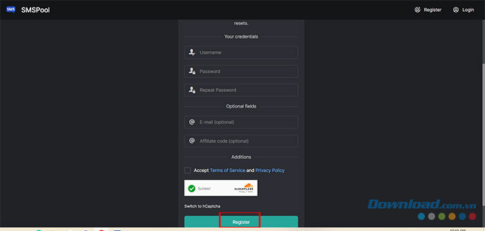 Sau khi điền đầy đủ thông tin, nhấn Register để xác nhận đăng ký tài khoản SMSPool.