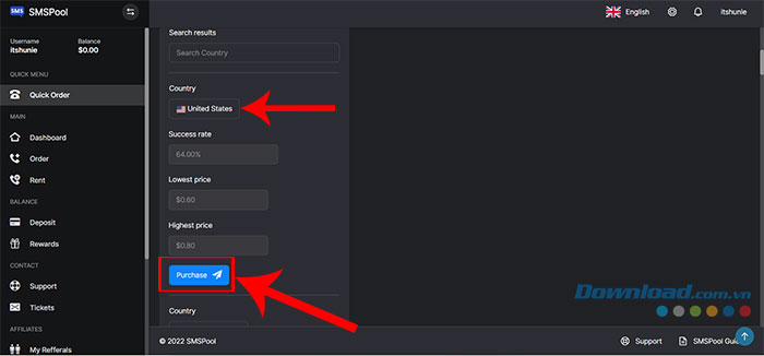 Sau khi chọn thông tin, chi phí mua số điện thoại Mỹ sẽ xuất hiện tại mục Country có hiển thị United States. Mọi người cần nhấn Purchase để tiến hành mua số điện thoại.